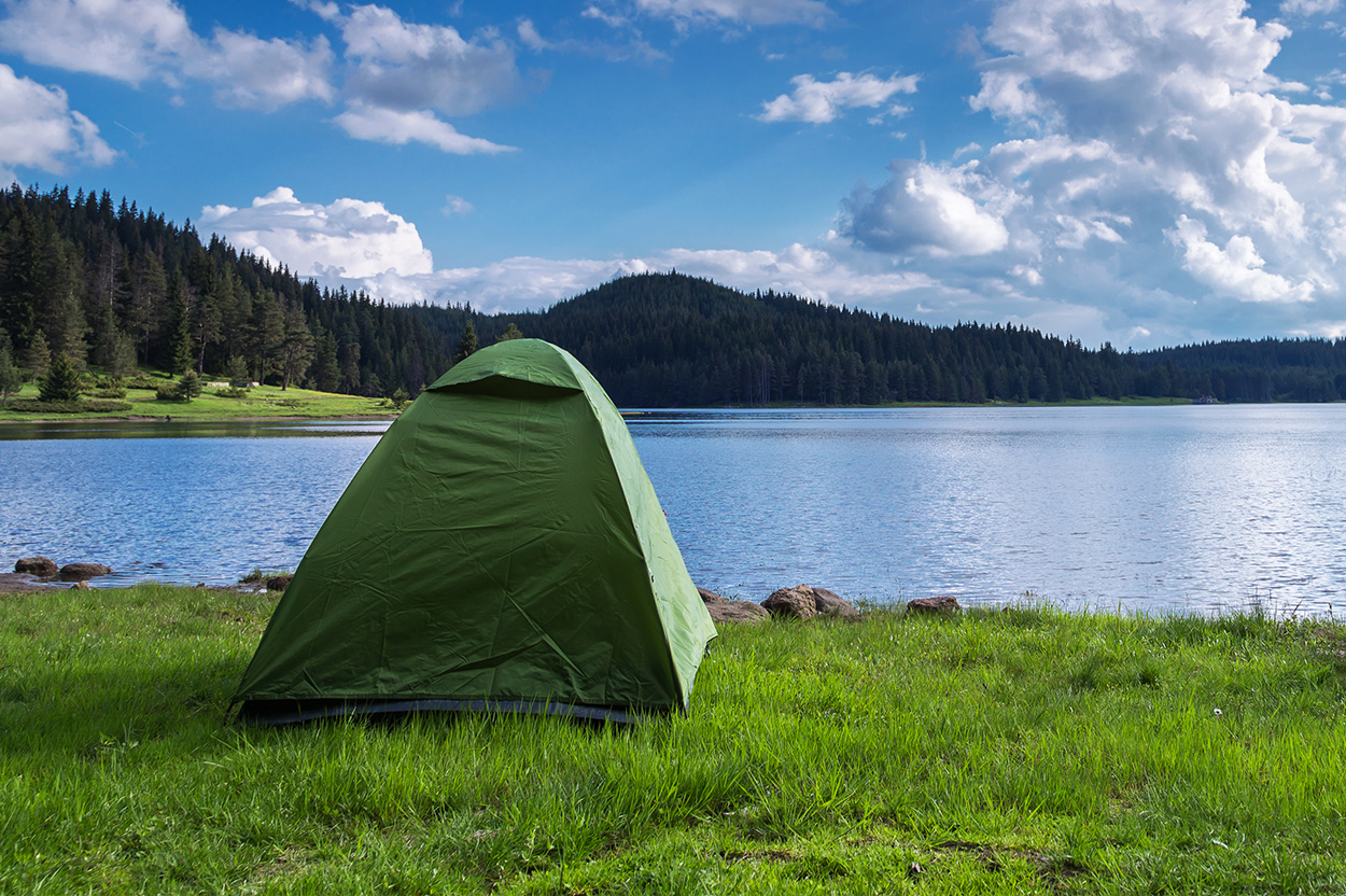 Лагерь на берегу водоема предполагает купание и игру в волейбол.