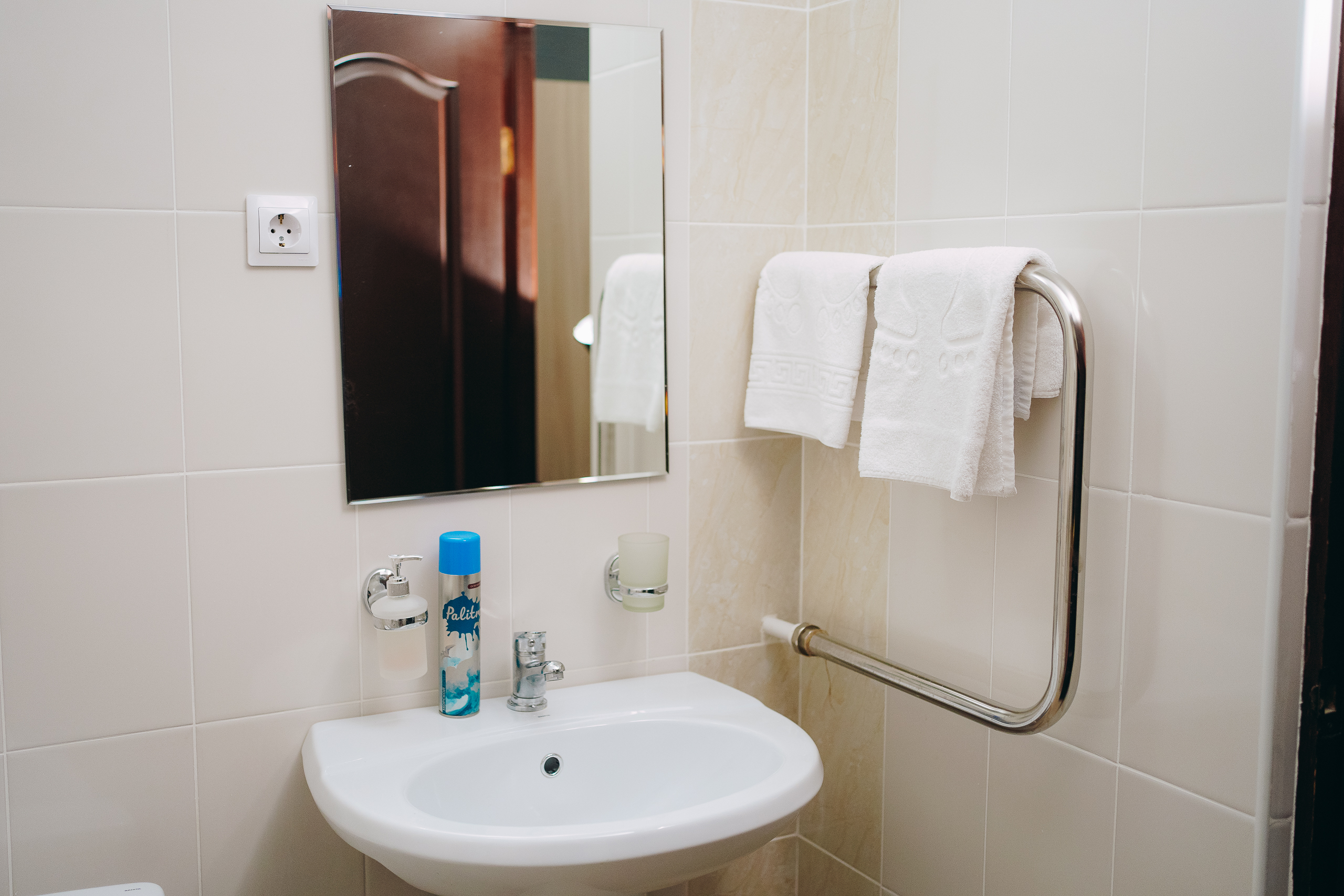 Санузел: раковина, унитаз, зеркало, комплект полотенец.