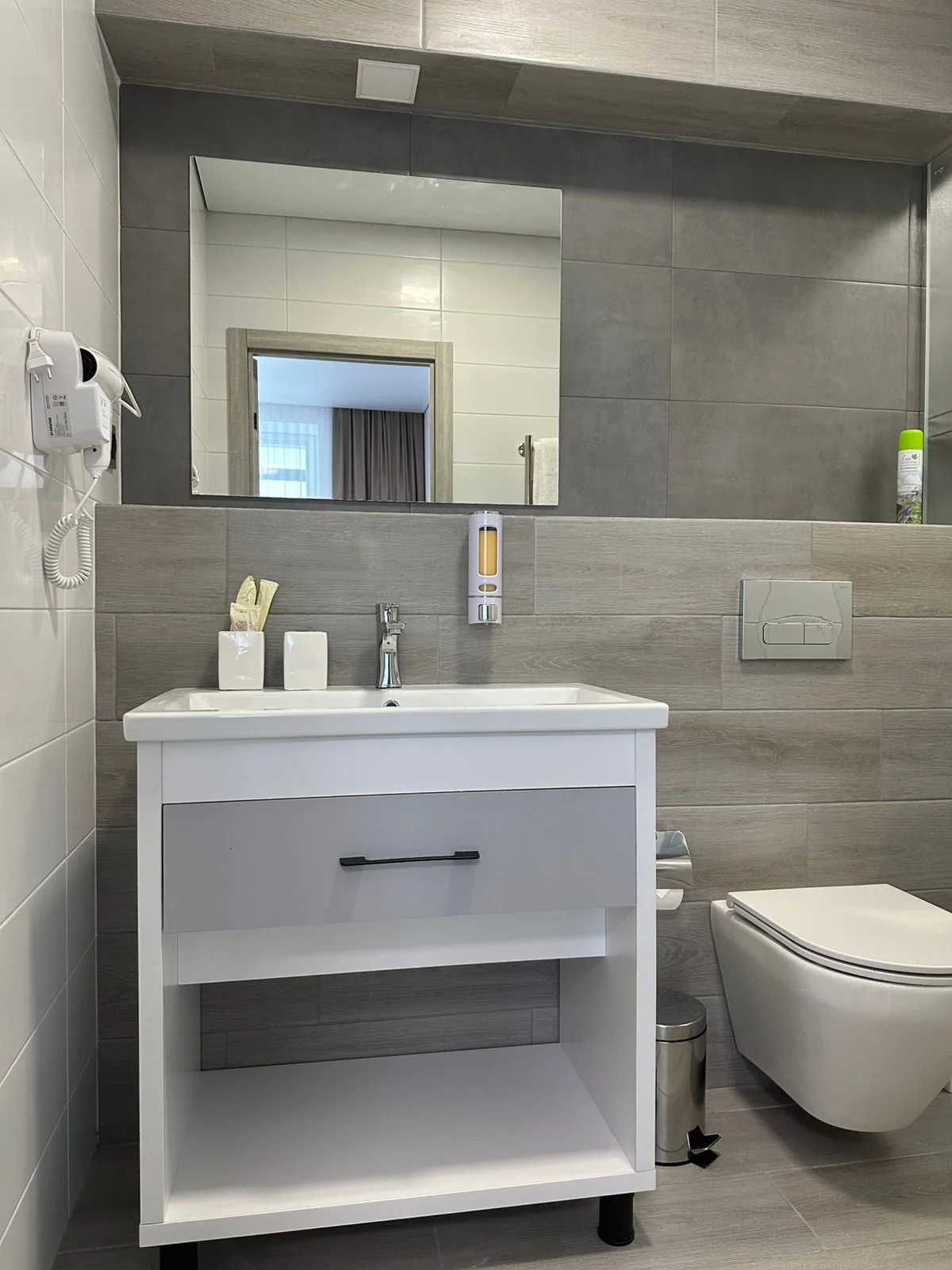 Санузел: душевая кабина, умывальник, унитаз, зеркало, комплект полотенец, фен, халат, индивидуальные косметические наборы.